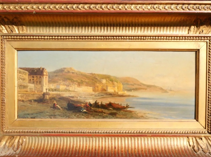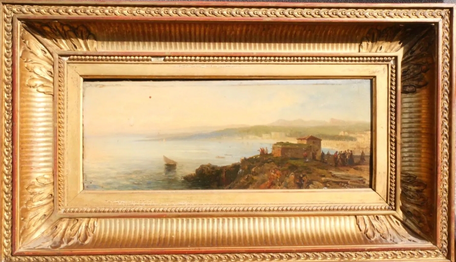 Mercredi 8 juin 2022, un collectionneur a remporté la vente de la paire de panneaux en bois représentant des paysages de bord de mer, animés. L’une est signée en bas à droite et l’autre en bas à gauche et daté 1862 – 11x27cm – Porte une étiquette au dos – Jolies cadres doré XIXème.